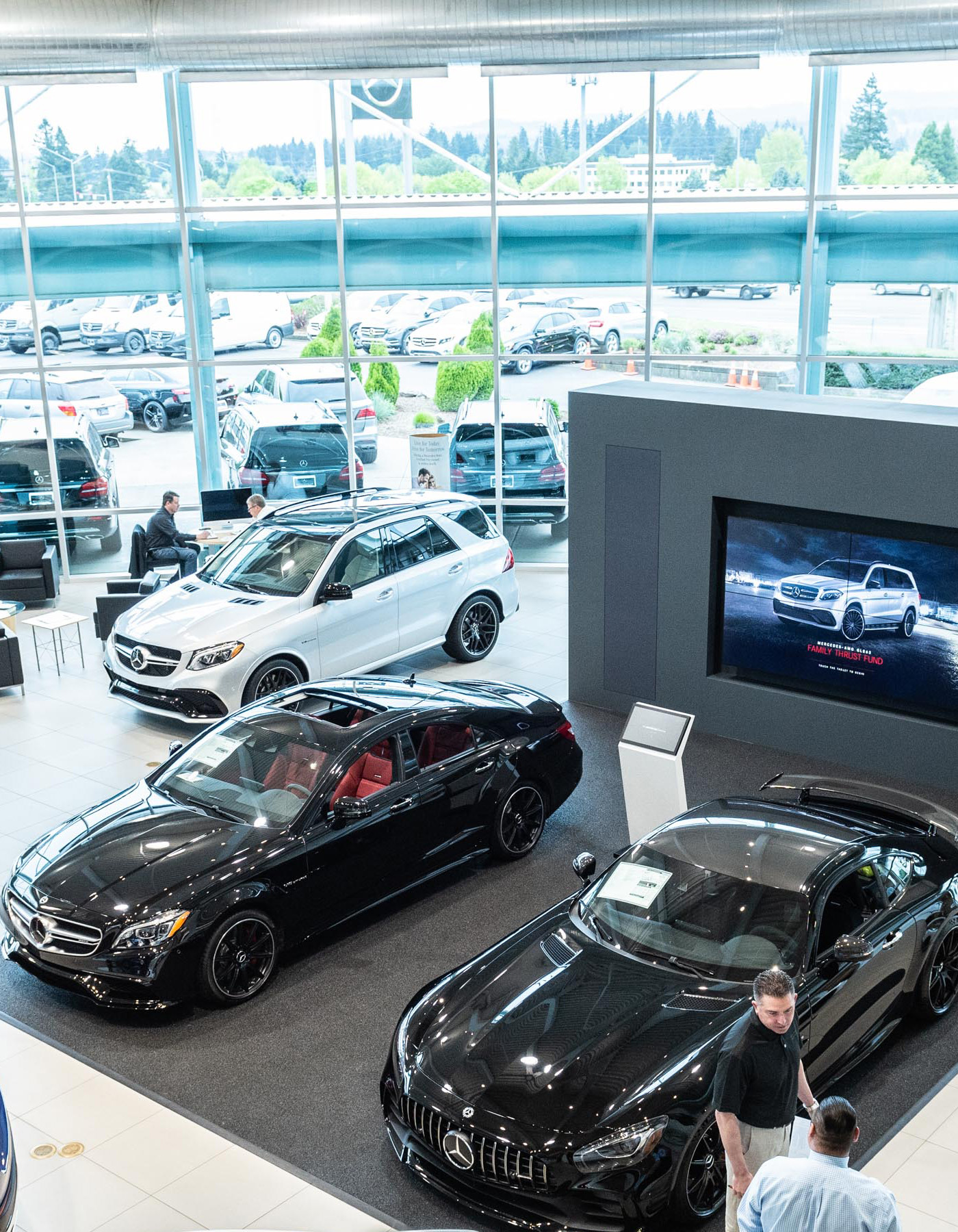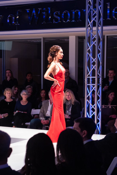 Mercedes Benz of Wilsonville is located on a five-acre site highly visible from the I-5 freeway. The two-story showroom faces the freeway, with a dramatic curving glass curtain wall and suspended canopy. The building in total is over 100,000 square feet. The fashion show was in the massive showroom with the service center operating valet service for guests. Mercedes Benz of Wilsonville is the only Oregon dealership with an AMG Performance Center.